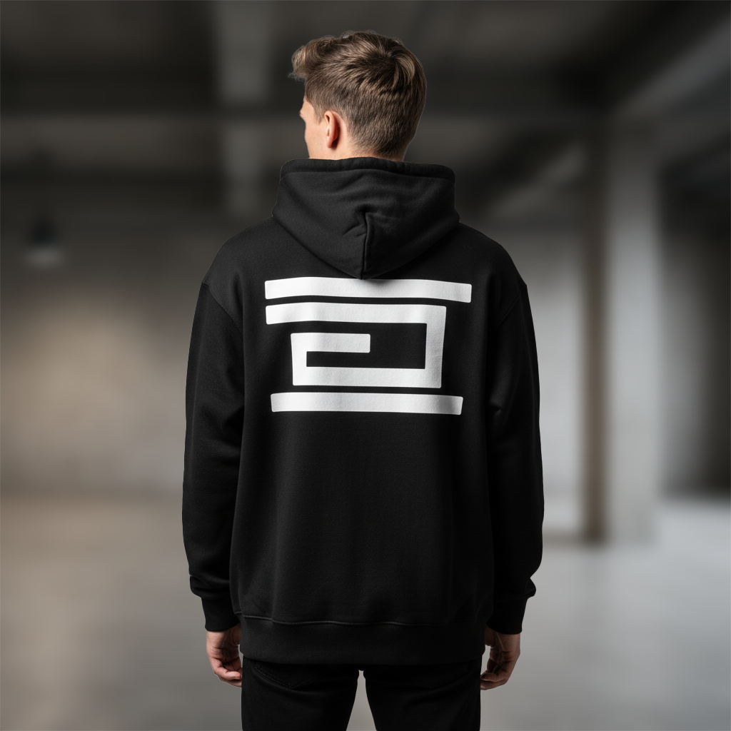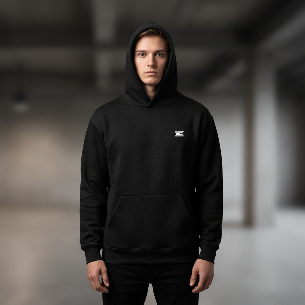 A pullover hoodie crafted from a fine, soft and sturdy blend of cotton and recycled polyester. It features a relaxed silhouette with dropped shoulders, a kangaroo pocket, self fabric lined darted hood, featuring an urban, elevated look. High quality cuffs and bottom hem in 1x1 rib.