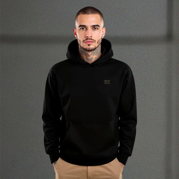 A pullover hoodie crafted from a fine, soft and sturdy blend of cotton and recycled polyester. It features a relaxed silhouette with dropped shoulders, a kangaroo pocket, self fabric lined darted hood, featuring an urban, elevated look. High quality cuffs and bottom hem in 1x1 rib.