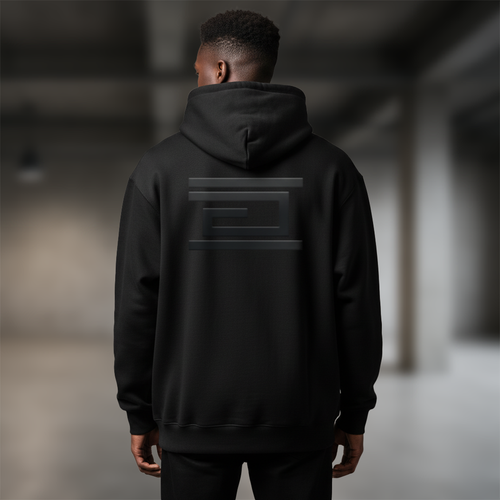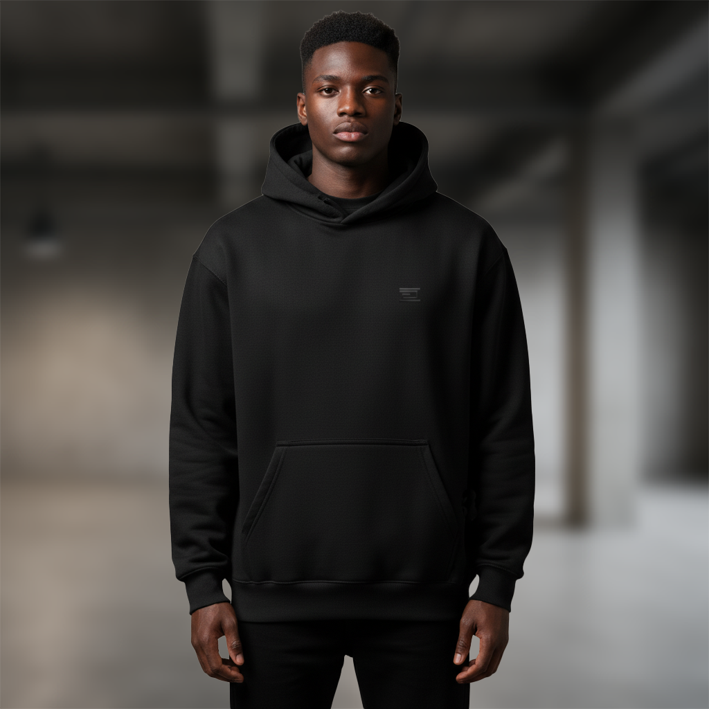A pullover hoodie crafted from a fine, soft and sturdy blend of cotton and recycled polyester. It features a relaxed silhouette with dropped shoulders, a kangaroo pocket, self fabric lined darted hood without drawcords, featuring an urban, elevated look. High quality cuffs and bottom hem in 1x1 rib.