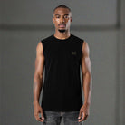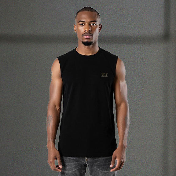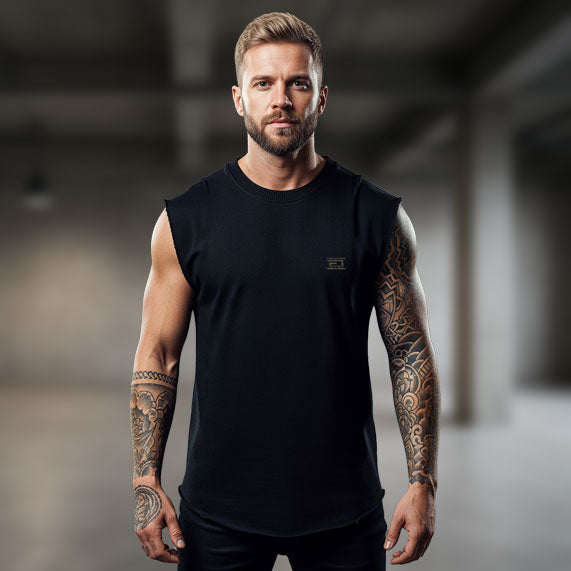 A loose-fit raw edge vest with a ribbed crew high neck. Made from a blend of soft cotton and recycled polyester.