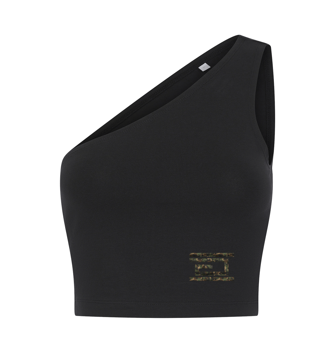 A slim fit one shoulder top with a fitted neckline made from a smooth blend of cotton and elastane. It features a double layer and silicone grip tape on the front, with twin needle stitching on the hem, neck, and armholes.