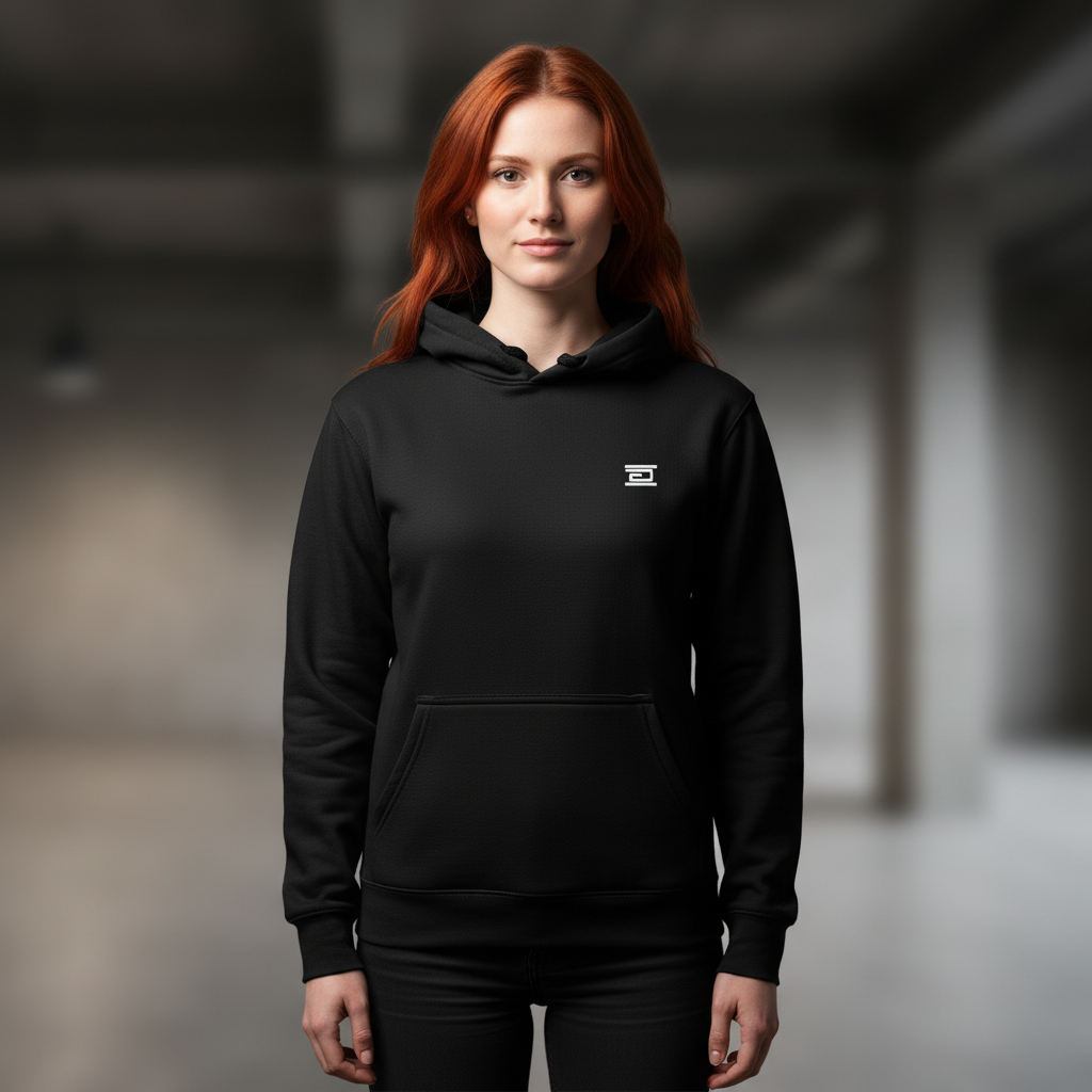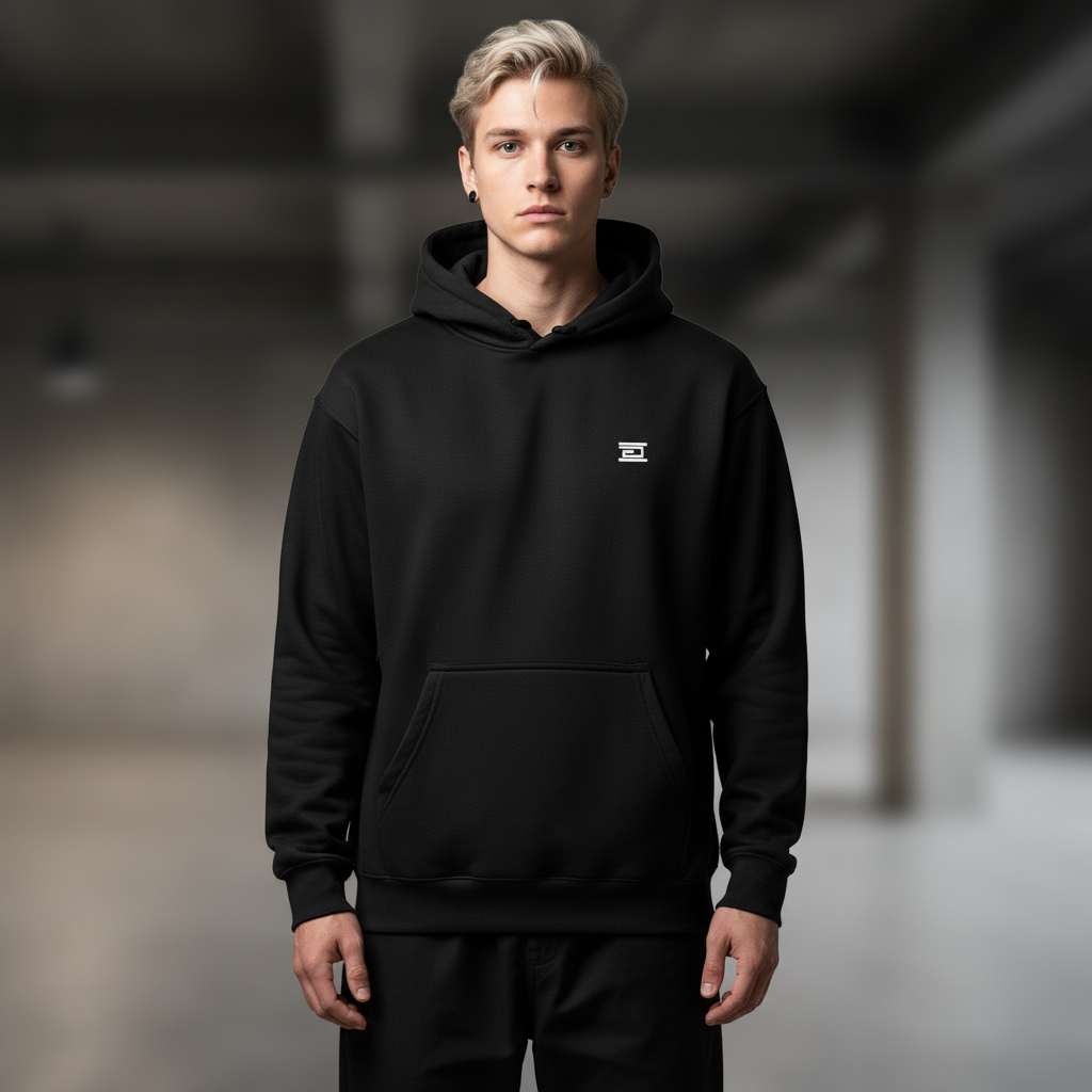 A pullover hoodie crafted from a fine, soft and sturdy blend of cotton and recycled polyester. It features a relaxed silhouette with dropped shoulders, a kangaroo pocket, self fabric lined darted hood, featuring an urban, elevated look. High quality cuffs and bottom hem in 1x1 rib.